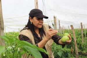 Foto 7 La ministra Laura Suazo observando si el cultivo de tomate tiene algún problema fitosanitario.
